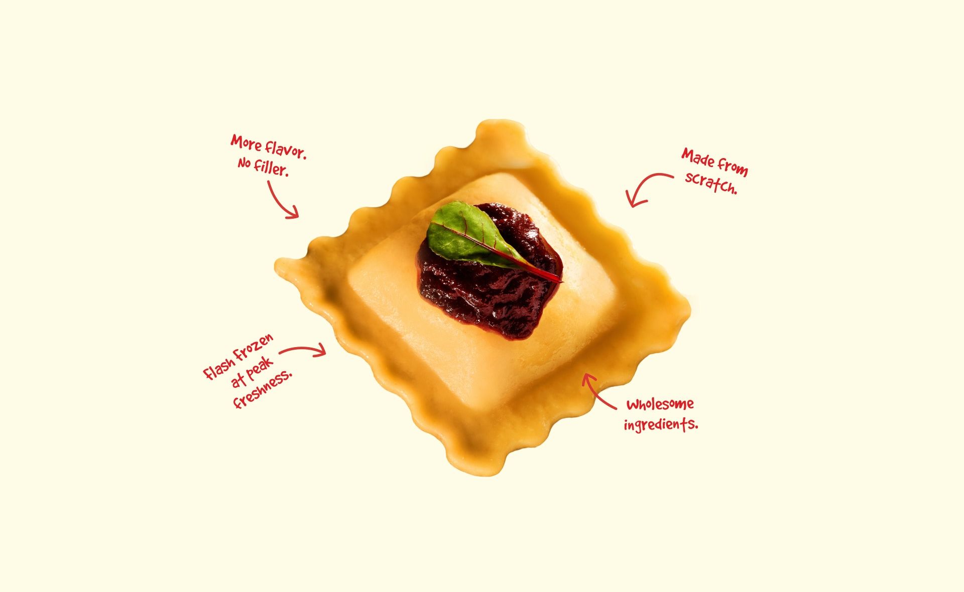 The brand color palette draws directly from the rich, indulgent recipes of Ripi’s pasta. Deep reds, golden orange, and rich burgundy evoke the vibrancy of crushed tomatoes, the warmth of roasted sweet potatoes, and the depth of slow-braised beef in a red wine jus. These tones, paired with a soft cream background, create a sense of warmth, richness, and approachability. This provides a neutral canvas for brand photography to shine. Imagery is vibrant and abundant—capturing sauces dripping, fillings spilling, and ravioli stacked high to visually express Ripi’s mission of “filling life with more of the good stuff.” Each image feels rich, indulgent, and energetic inviting customers to dive in and experience the flavors for themselves.